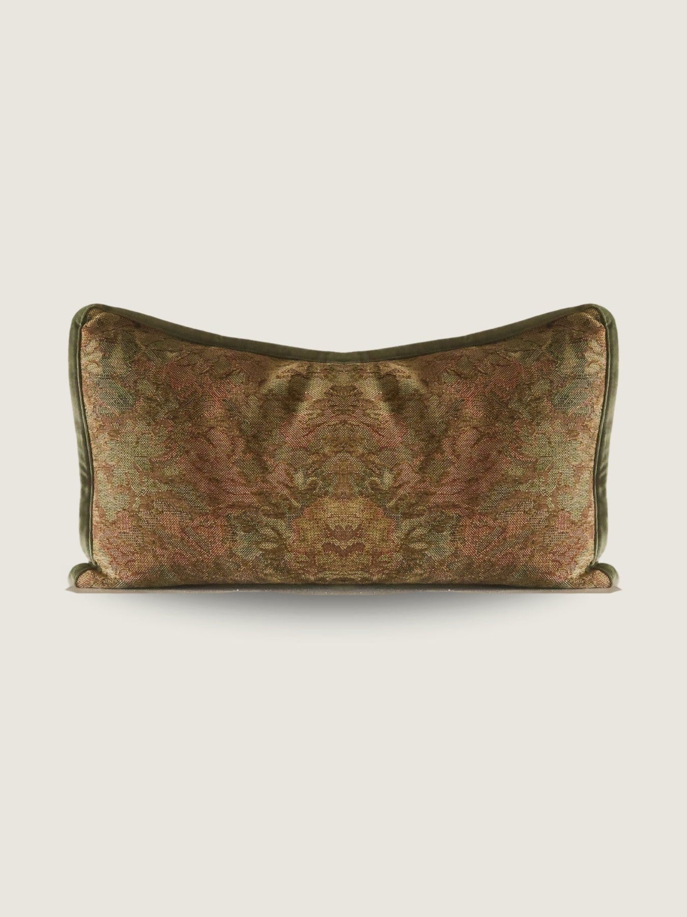 Sylvie is a masterpiece of Renaissance-inspired elegance. This jacquard pillow features a cream base with shades of muted red and green patterns on the front. When reversed, it showcases a brown base with shades of muted red and green patterns and a green velvet edge on the reverse. Adorned with intricate floral and leaf patterns reminiscent of the lush botanical motifs found in Renaissance paintings, Sylvie is finished with a sumptuous velvet trim, adding a touch of luxurious texture. Its reversible design offers versatility, presenting another captivating pattern to suit your mood and style. This pillow invites you to transform your home into a gallery of refined elegance.